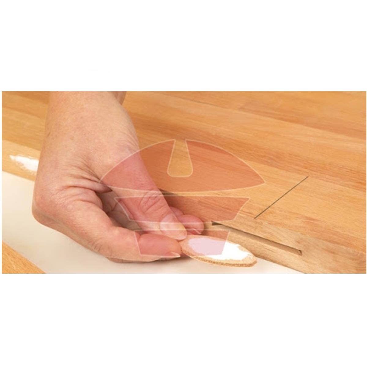 Daha sonra, levhaları ayırın ve bisküvi kavelanızı bisküvi için uygun ebatta ayarlayın. Uçtan uca bağlantılarda, büyük olasılıkla büyük No : 20 ( 24 mm x 58 mm ) boyutunu kullanacaksınız. Kılavuz telini ahşabın üzerine yerleştirerek, kesme kılavuzunu kurşun kalem kullanarak işaretleyin. Telin yerinde durmasını sağlayın, testereyi çalıştırın ve motor tam güçte iken bıçağı ahşabın içine daldırın ve sonuna kadar ilerleyin. Ardından bıçağı tamamen geri çekin ve bir sonraki işarette aynı işlemi tekrarlayın.