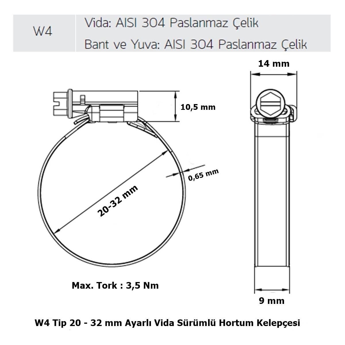 Mikalor 200 Adet W4 Hortum Kelepçesi 20-32 mm 304 Paslanmaz