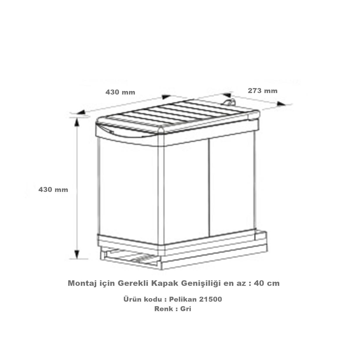 Modül Genişliği (mm.) 400 Kapasite (lt.) 20 + 1 lt. Mekanizma Otomatik Ürün Ölçüsü (mm.) G x D x Y 273 x 430 x 430 Gövde Cinsi Plastik Plastik Renk Açık Gri