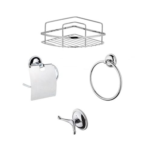 1 Adet Tek Katlı Metal Köşelik Krom 1 Adet Kapaklı Wc Kağıtlık 1 Adet Yuvarlak Havluluk 1 Adet 2 li Bornoz Askılık
